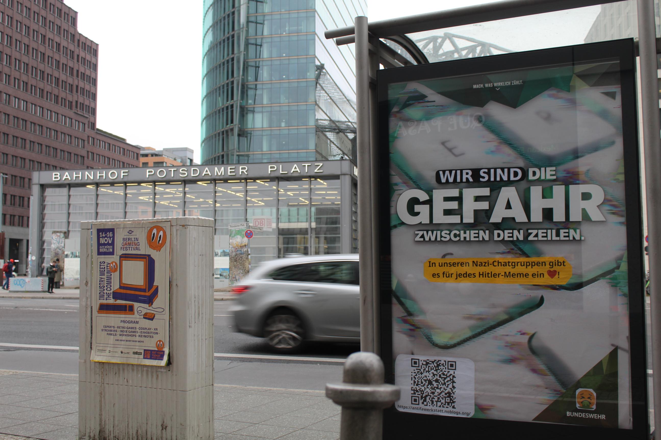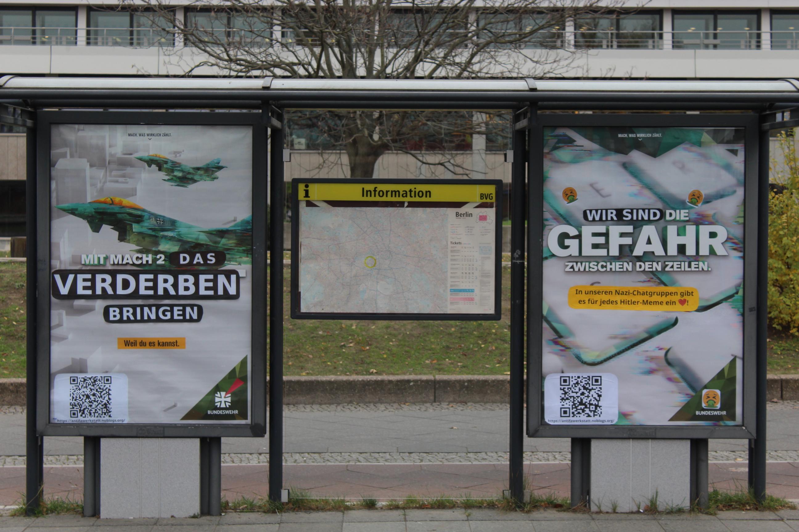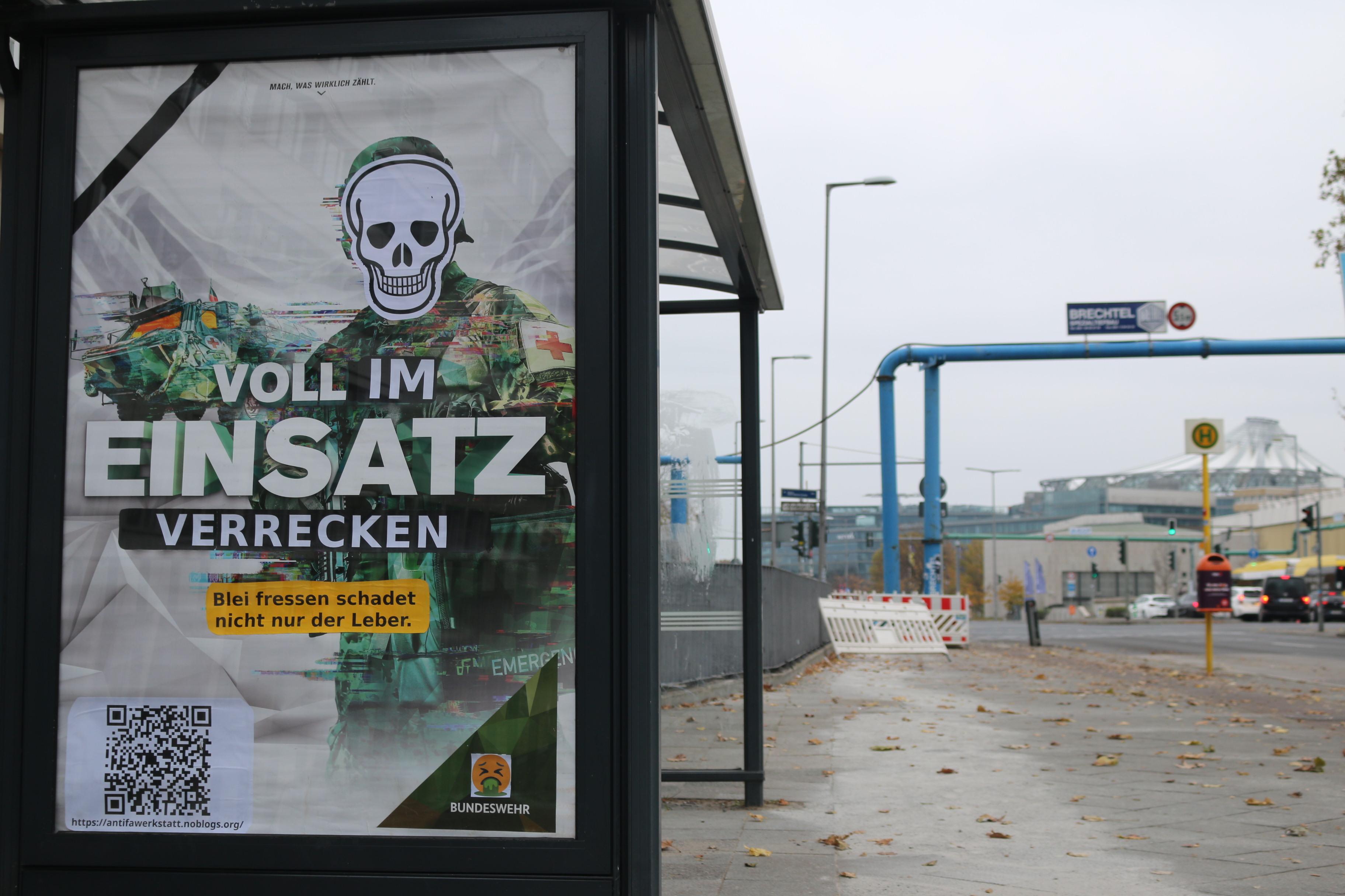 „Huch, seit wann spricht denn die Werbung der Bundeswehr offen und ehrlich über sexualisierte Gewalt, Nazi-Chatgruppen und über das Morden und Verrecken im Militär?“ Das dürften sich Passantinnen am Wochenende in Berlin gefragt haben. Denn in über 50 Werbevitrinen an Bus- und Bahnhaltestellen in Tiergarten, Mitte und Schöneberg konnten ihnen satirisch veränderte Bundeswehrplakate begegnen. Für die Aktion hatte sich die neu gegründete „Werkstatt für Antifaschistische Aktionen (W2A)“ Bundeswehrplakate der Kampagne „Weil du es kannst“ ausgeliehen, mit Überklebern versehen und unter Nutzung einfachsten Baumarkt-Werkzeugs unauthorisiert wieder in die Werbevitrinen der Wall GmbH gehängt. „Natürlich vor allem rund ums Kriegministerium!“ freut sich Luca Klatt, Sprecherin der Werkstatt für Antifaschistische Aktionen: „Weil die Mitarbeiter*innen des Kriegsministeriums sich am Montag Morgen auf der Weg zur Arbeit darüber ärgern, wie wir ihre Imagekampagne zum Bumerang gemacht haben!“