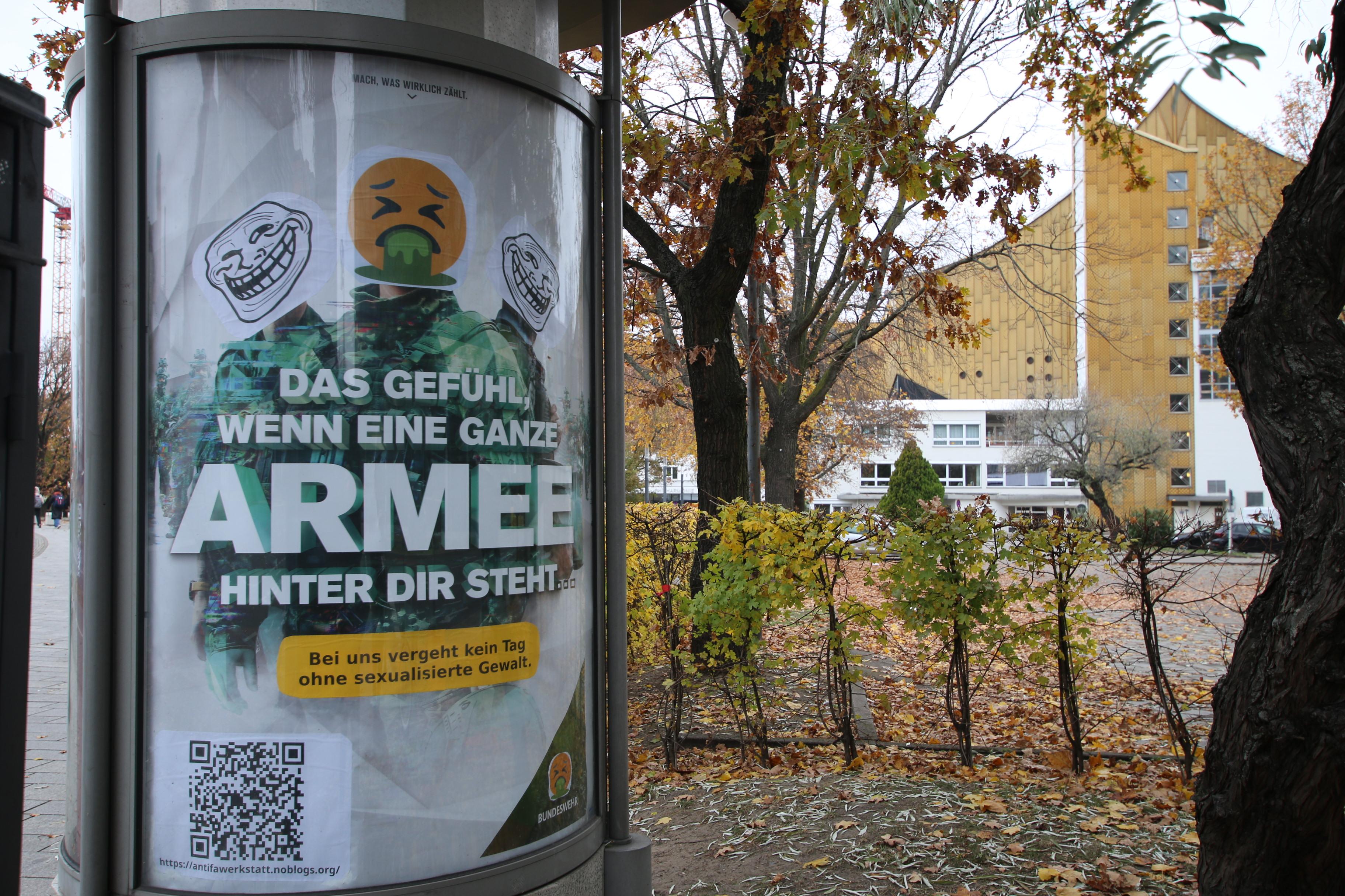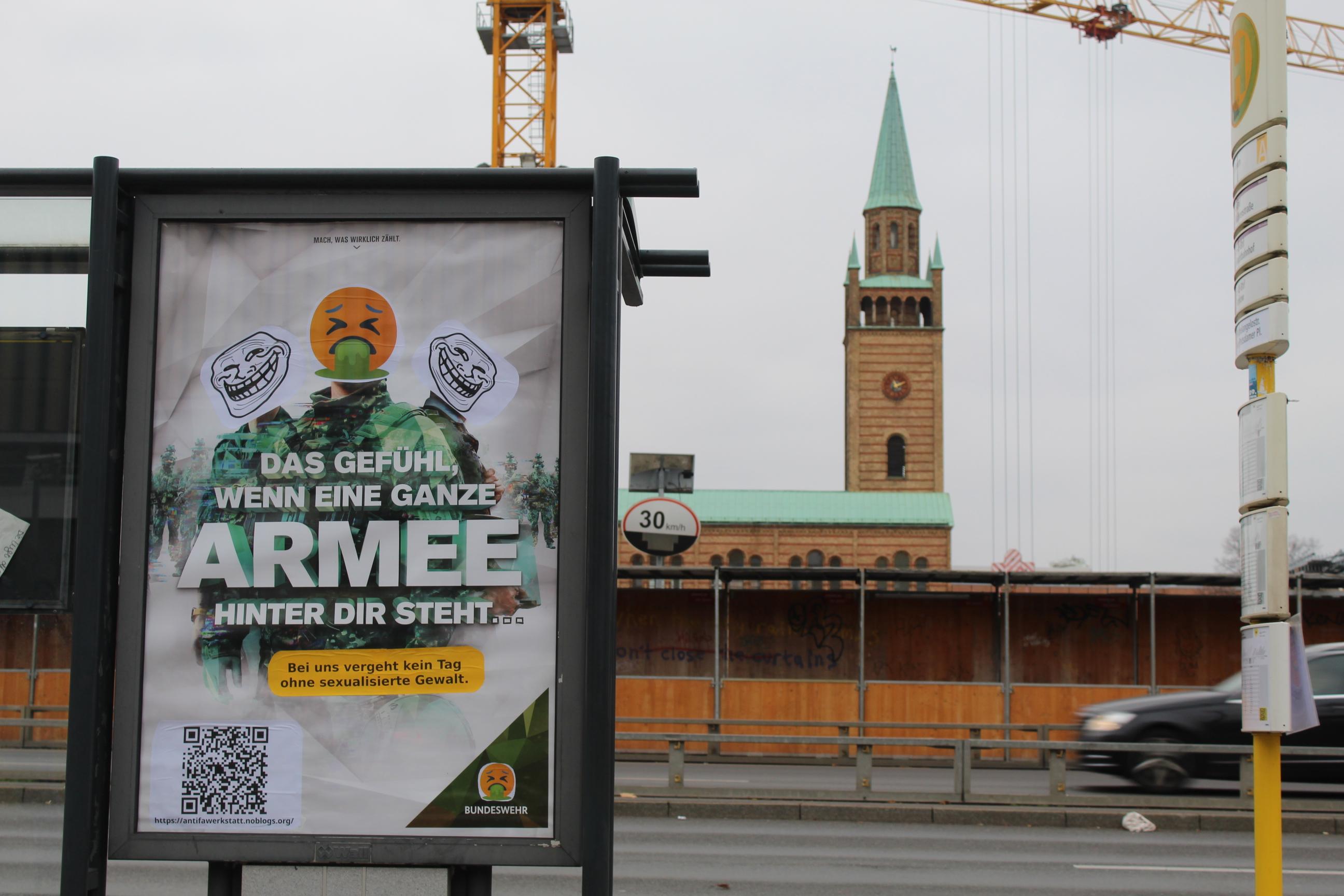 Den Originalslogan „Das Gefühl, wenn eine ganze Armee hinter dir steht“ ergänzten die Aktivistinnen der Werkstatt lediglich mit nachdenklich stimmenden Auslassungspunkten „…“. Das Poster zeigt zwei Soldaten, die hinter einer Soldatin stehen, deren Gesicht die Aktivist*innen mit einem kotzenden Smiley überklebten. Ein gelber Textkasten erklärt das Problem: „Bei uns vergeht kein Tag ohne sexualisierte Gewalt.“