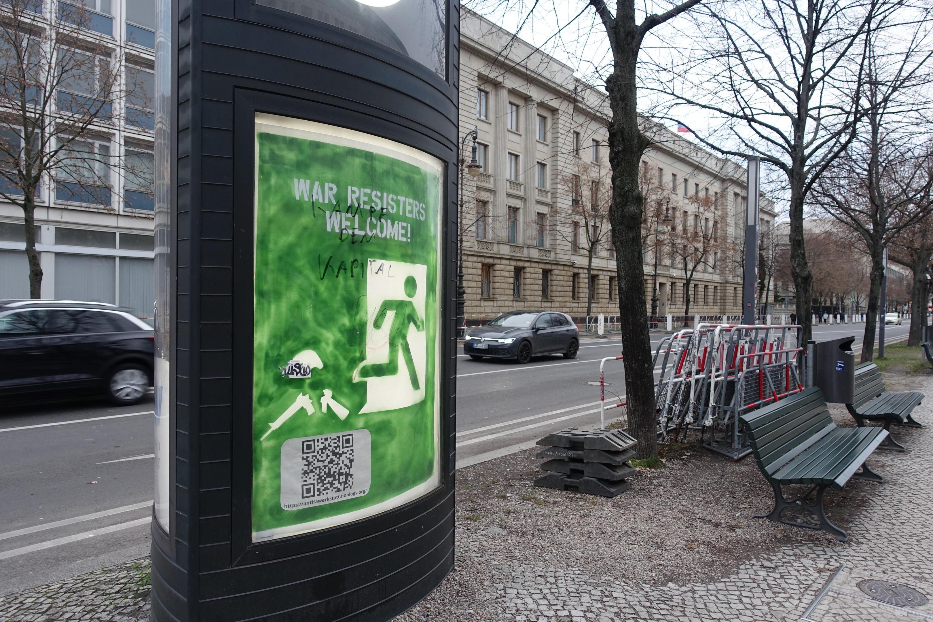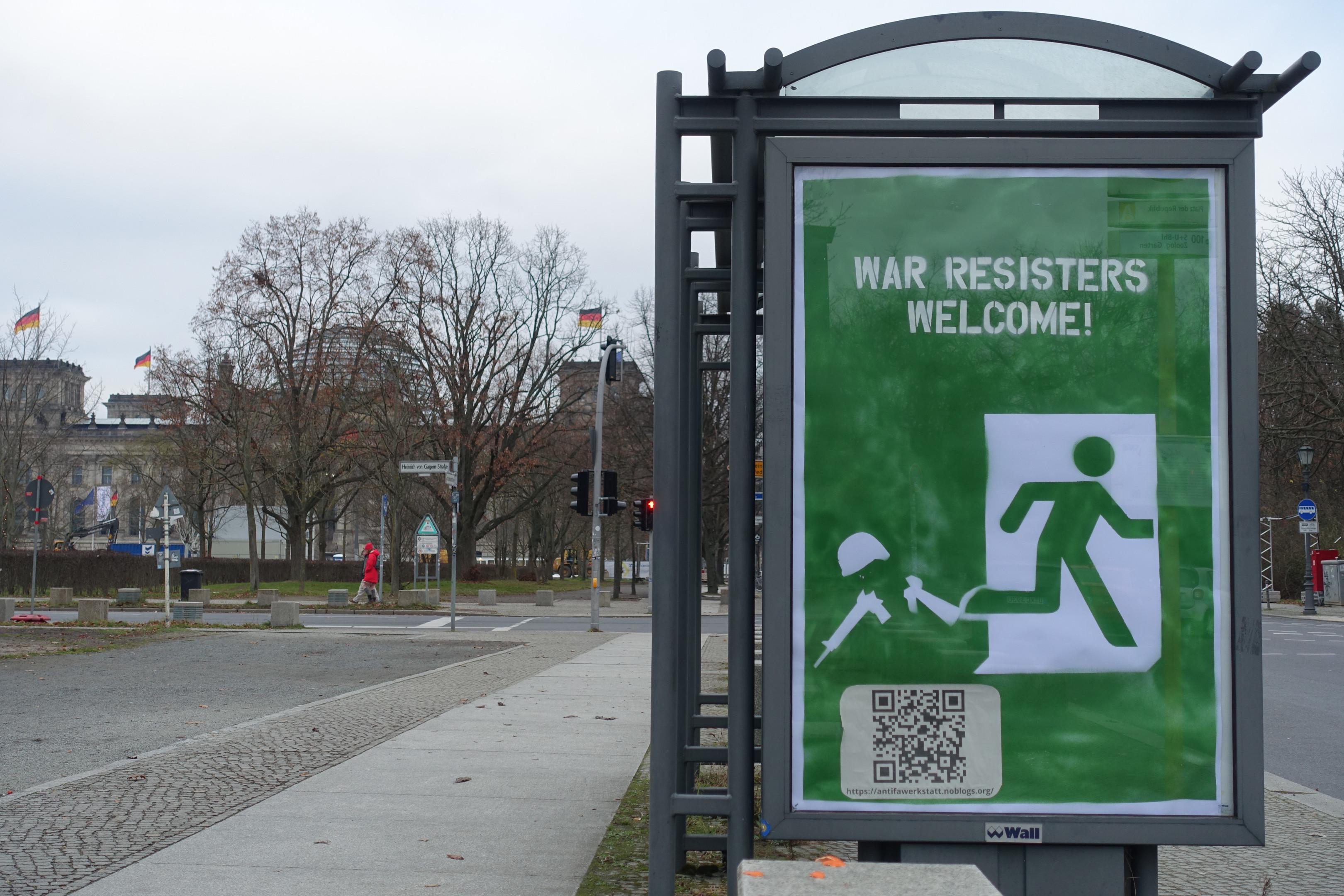 Groß und grün hängen sie in den Werbevitrinen der Tram- und Bushaltestationen der Berliner Innenstadt: In Handarbeit gebastelte Poster der Werkstatt für antifaschistische Aktionen zeigen eine leicht bearbeitete Version des bekannten Symbols für Notausgänge. Die aus dem Notausgang rennende Person hat hinter sich ein zerbrochenes Gewehr und einen Stahlhelm fallen lassen und stellt dadurch eine Kriegsdienstverweiger*in dar. „War Resisters welcome!“ steht in Großbuchstaben über dem Bild. „Mit unserer Aktion machen wir darauf aufmerksam, dass Kriegsdienstverweiger*innen aus Ukraine, Belarus und Russland hohe Hürden für einen Aufenthalt in Deutschland in den Weg gestellt werden“, sagt Kai N. Krieger von der Werkstatt für antifaschistische Aktionen: „Dabei müssen wir unbedingt Menschen unterstützen, die sich am Töten im Krieg nicht beteiligen wollen. Wir sprechen uns für ein Asyl für Kriegsdienstverweiger*innen aus!“