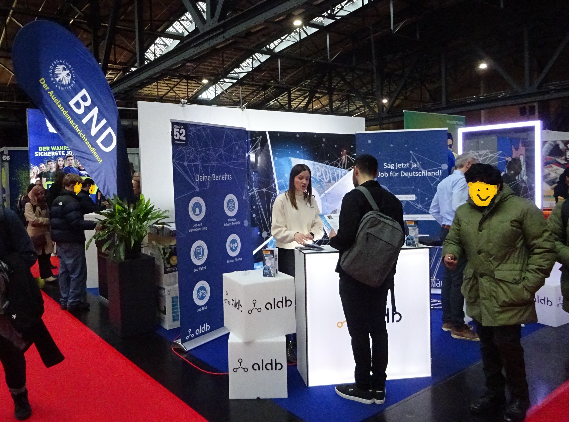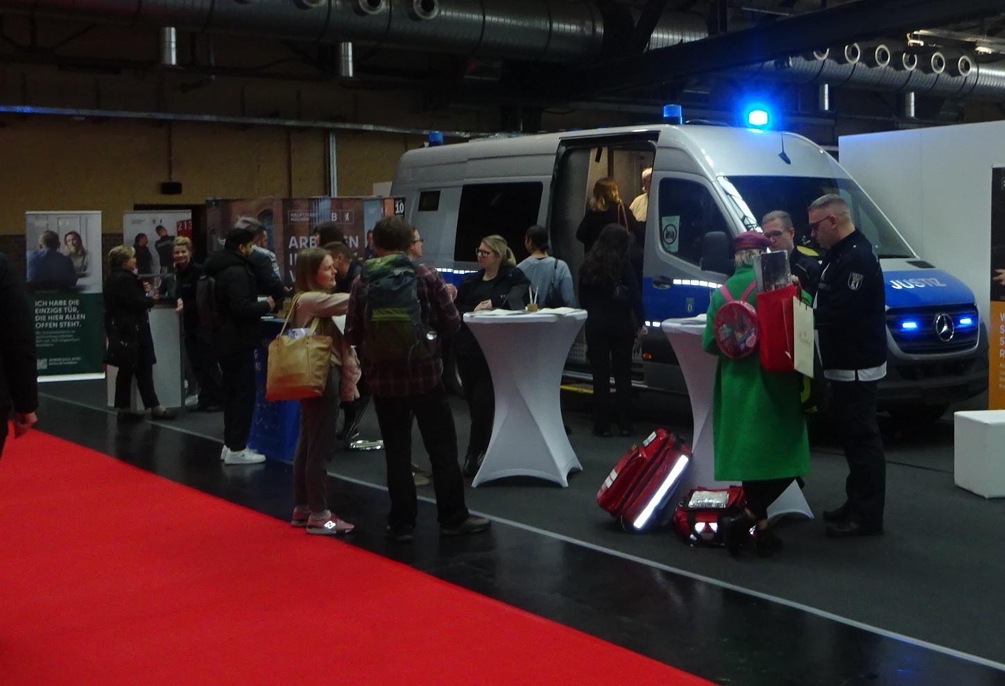 Auch wenn die Standfläche des brandenburgischen Justizvollzuges nur auf Platz 3 lag, haben sie der Polizei und dem Knast-Senat aus Berlin klar die Show gestohlen. Team Brandenburg hatte einfach einen Gefangenentransporter in der Halle geparkt und das Blaulicht dauerhaft laufen gelassen. Außerdem Bundespolizei, Zoll, BKA, BND – nur die Inlandsgemeindienste fehlten. Der zweite große Bereich der Anbieter*innen war aus der Pflegebranche, der Logistik und dem Verkauf.