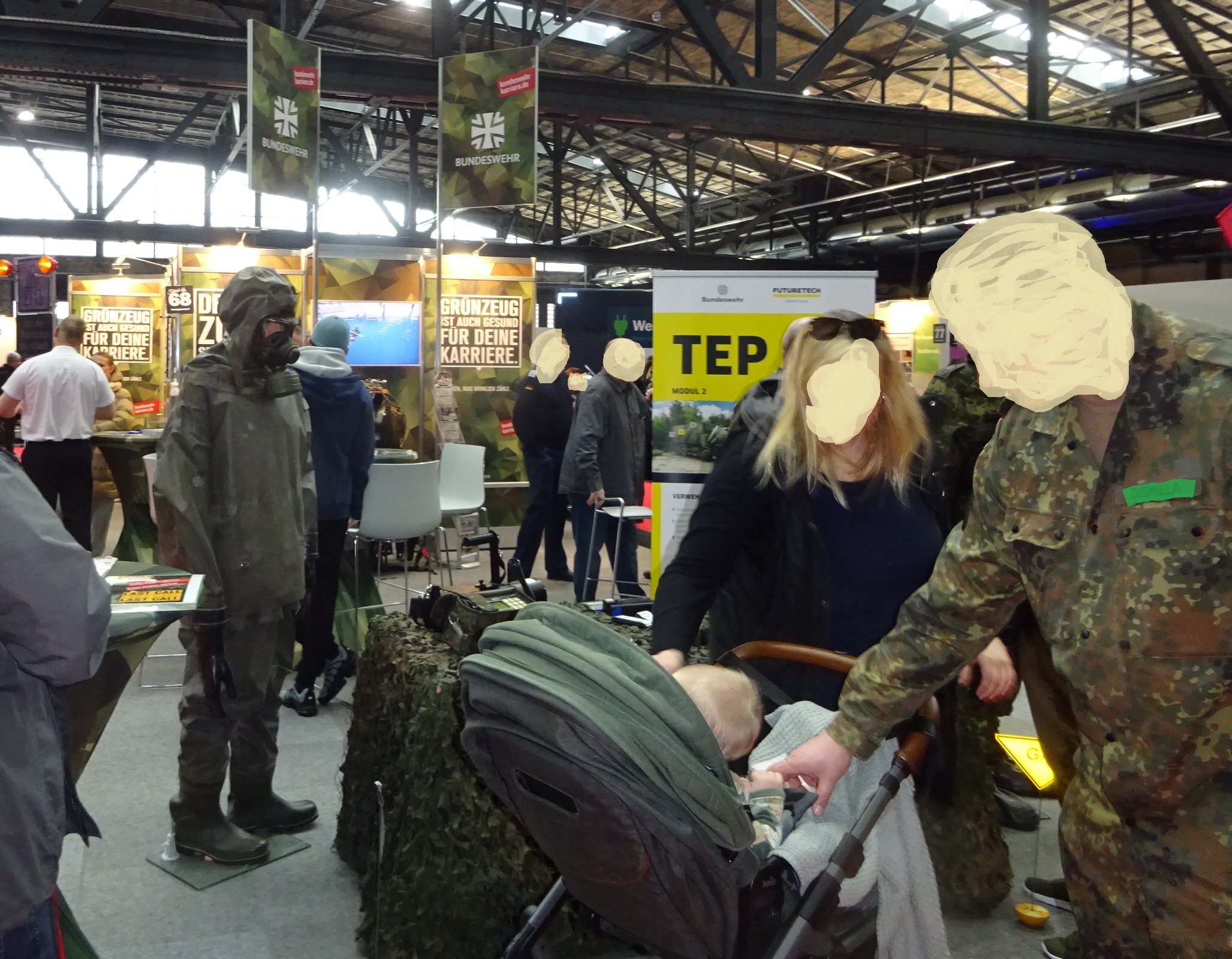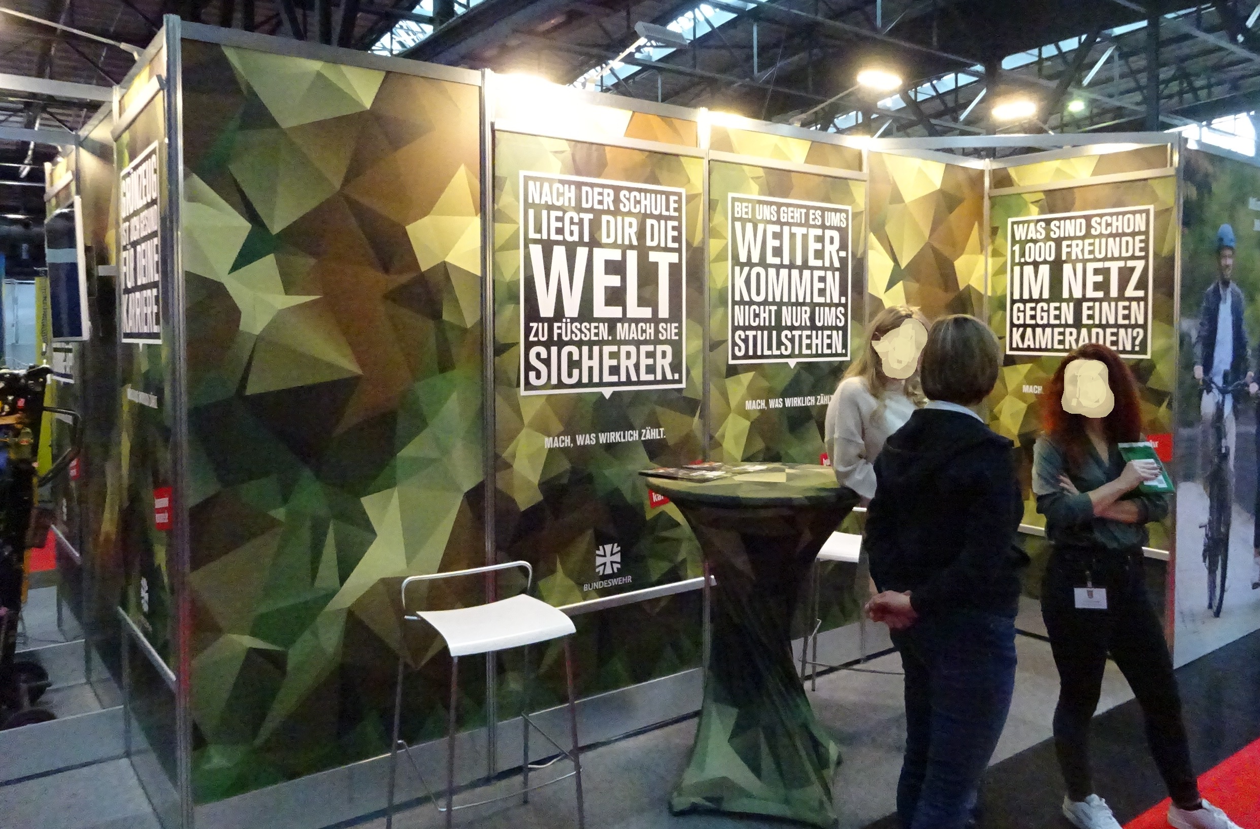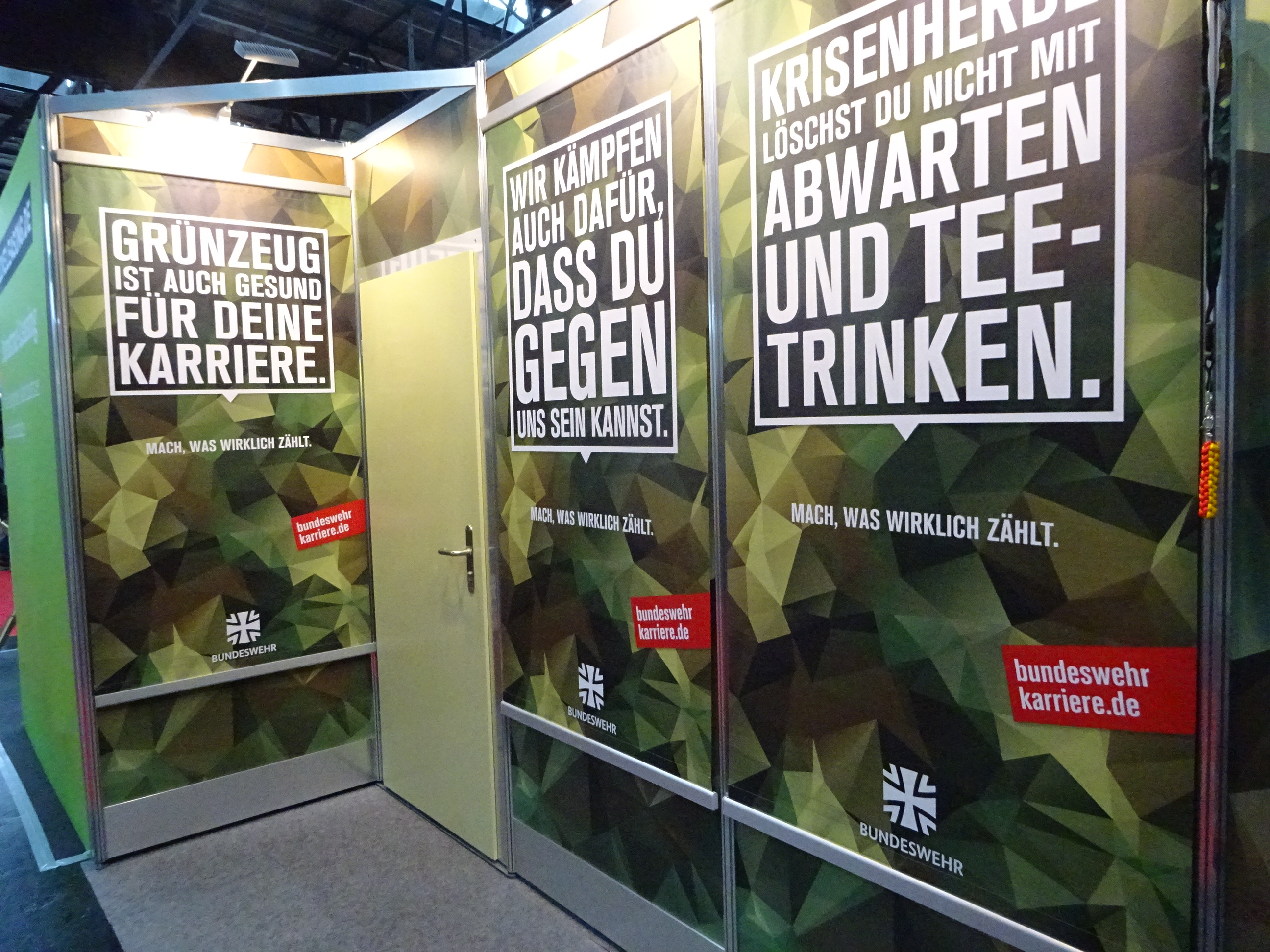 So battelte die Bundeswehr um den größten Stand mit Dussmann (Leiharbeitsfirma, die oft wegen miesen Bedingungen kritisiert wird, und alle Arten von Dienstleistungen verkauft, u.a. Wachschutz) und dem Knastministerium aus Brandenburg.
