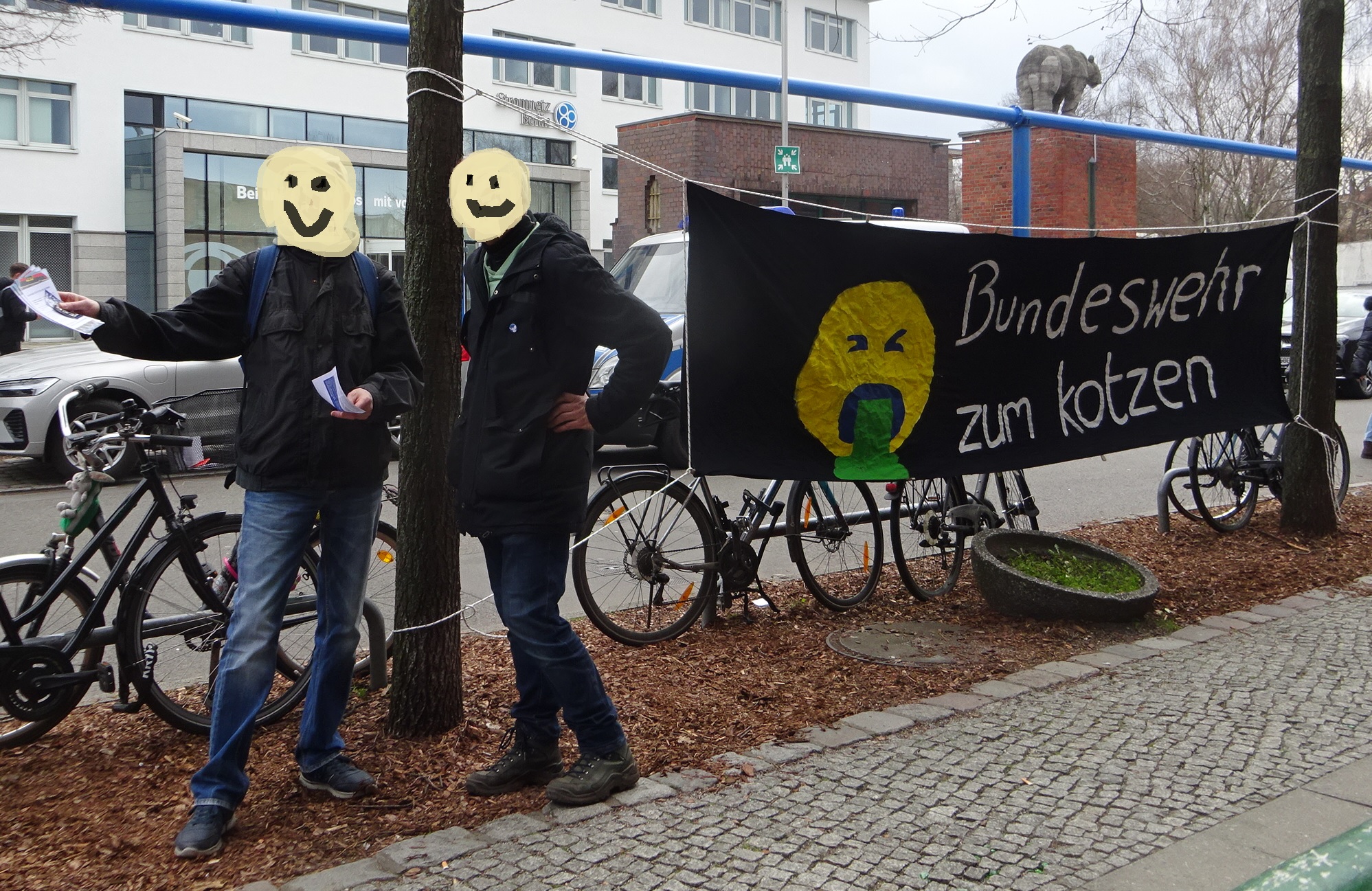Das hat es in Berlin lange nicht gegeben: Unsere sich neu gründende Aktivengruppe macht jetzt Jobmessen unsicher- zumindest für die Bundeswehr. Denn zum Eingangsbereich der Jobmesse in der Arena Treptow haben es am letzten Sonntag spektakuläre sieben unserer DFG-VK-Mitglieder mit lediglich leichter Verspätung geschafft: 13h am Wochenende ist in Berlin quasi mitten in der Nacht. Zuerst bauen wir die mitgebrachte „Friedens-Drohne“ auf, als Blickfang für kunstaffine Messebesuchende. Dann platzieren wir unser Banner zwischen zwei Bäumen und beginnen mit dem Flyer verteilen. Das läuft überraschend gut: In knapp über zwei Stunden haben wir 500 Flyer verteilt.