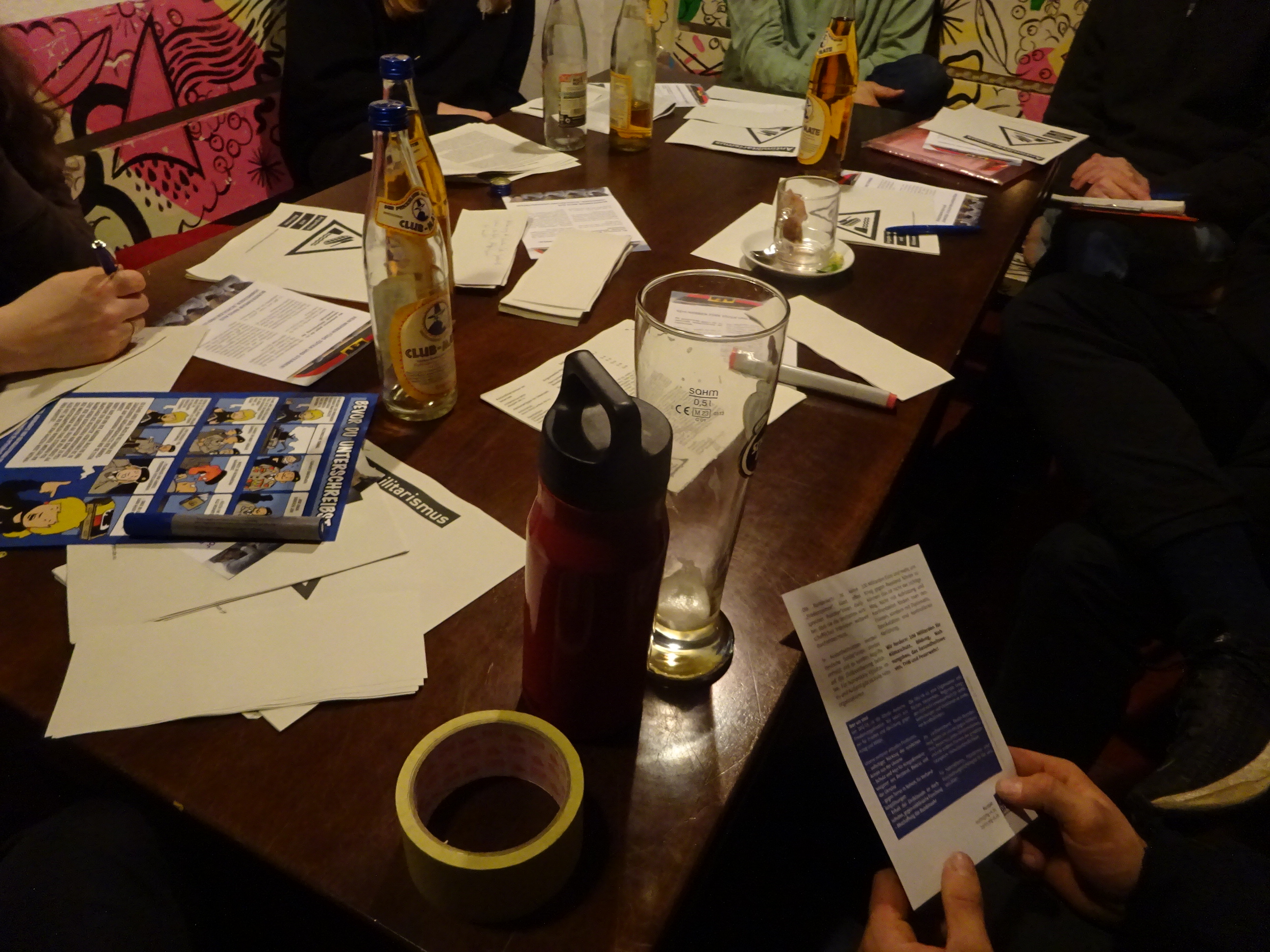 Die Auswertung der Aktion und neue Pläne machen wir beim nächsten Aktiven-Treffen. Das findet am Mittwoch, den 13.03. um 19h im Syndikat in der Emser Straße im ganz geheimen Hinterzimmer statt. Falls Du das ganz geheime Hinterzimmer noch nicht kennst, frage bitte am Tresen nach einer Wegbeschreibung zu uns. Wir besprechen: Wie war die Aktion? Was hat gut geklappt? Was war nicht so gut, was müssen wir besser machen? Wie machen wir weiter?