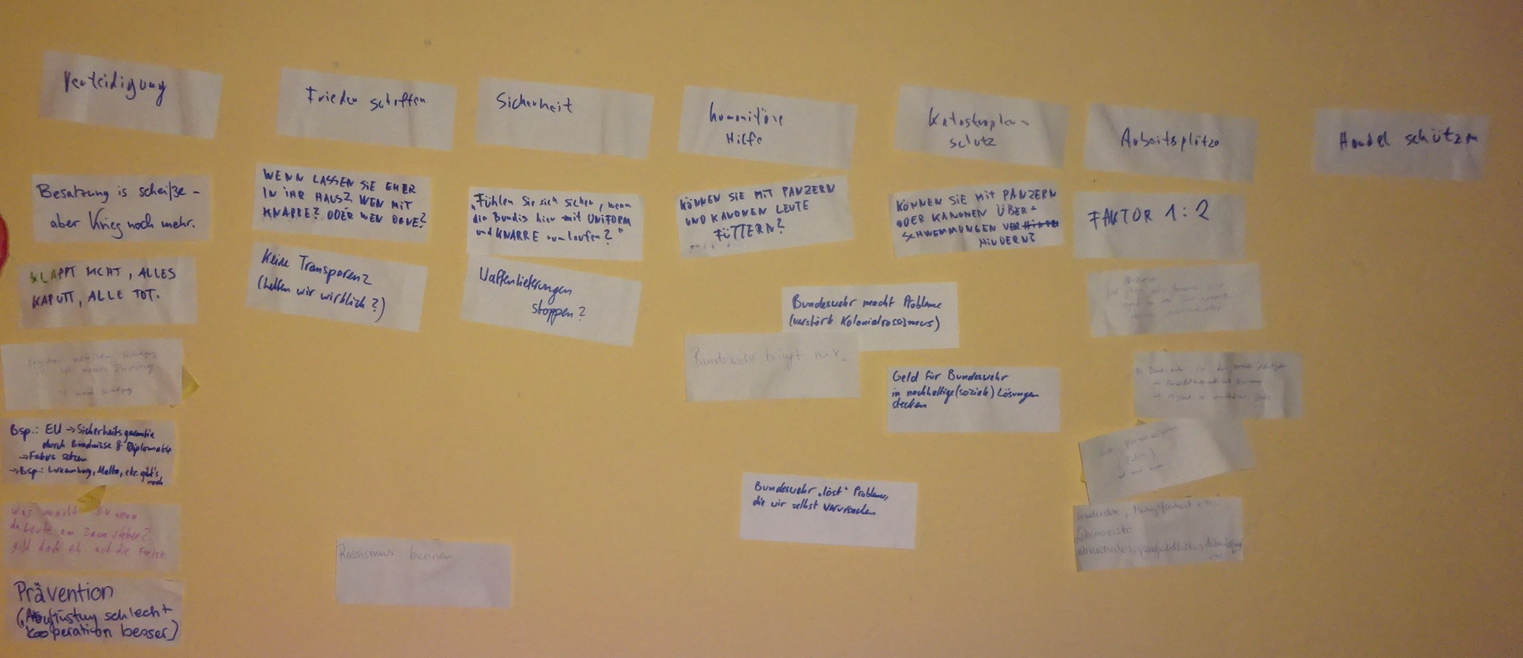 Das Thema, das den Menschen obenauf lag, war: Verteidigung. Was machen wir denn, wenn die Russen kommen? Wer schützt denn dann unsere Ostfront? Erstaunlich selten kam das vor der Corona-Zeit noch so häufige Narrativ ums „Frieden schaffen“ als Aufgabe der Bundeswehr. Die Bilder vom Abzug aus Afghanistan und die sich dort abspielenden Dramen sind wohl noch nicht vergessen. Sie dürften die Ablehnung der Beteiligung an postkolonialen Kriegen („Auslandseinsätze“) in der Bevölkerung deutlich erhöht haben.