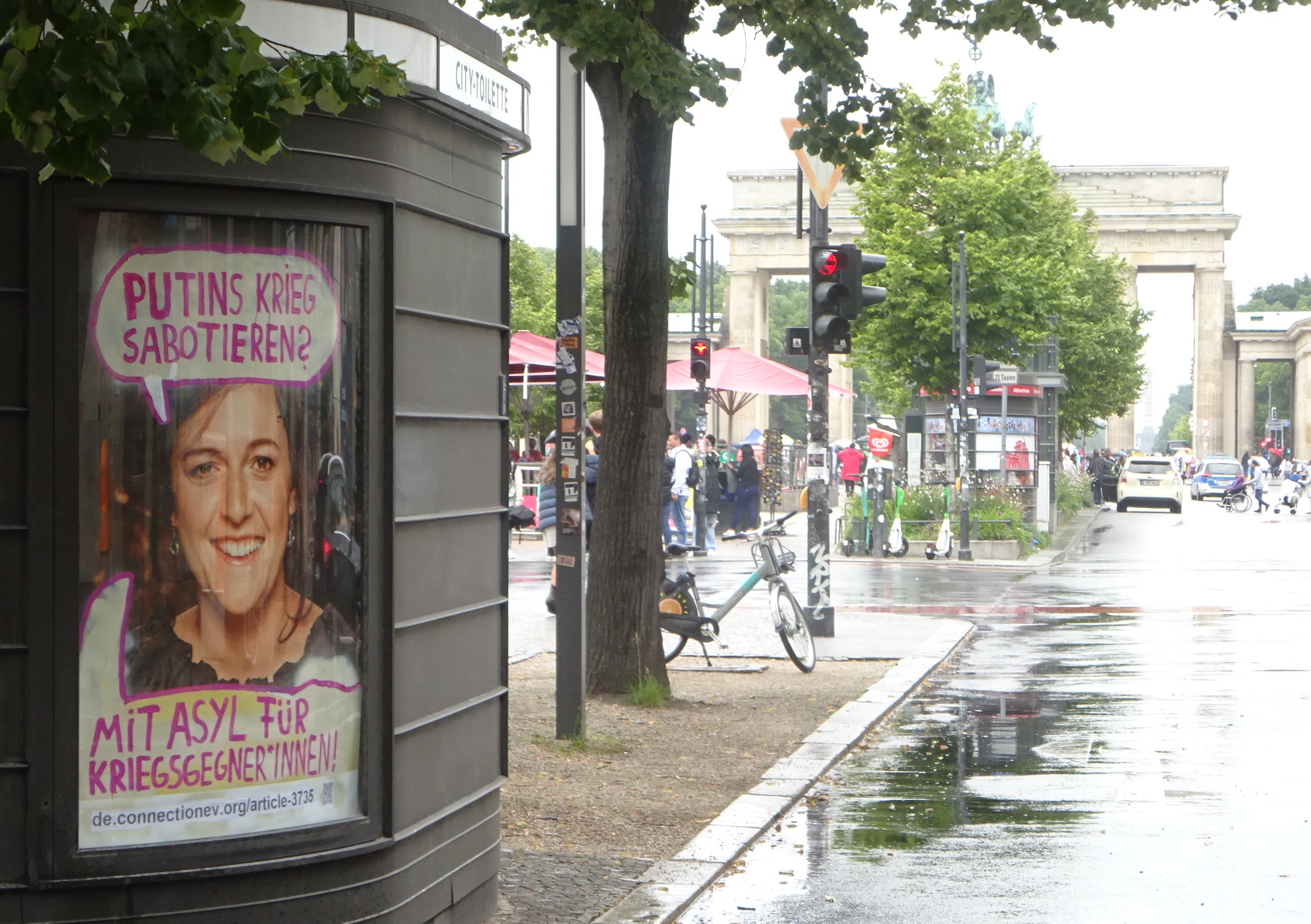Fundstück von Indymedia: „Mit dem Werbe-Plakat stimmt doch was nicht?“ Das dachten sicher sich heute auch Passantinnen, die durch Berlins Mitte flanierten. Denn die Kommunikationsguerilla-Gruppe „Asyl für Kriegsdienstverweigerer jetzt!“ (AfKj!) kaperte unerlaubt fast 20 Werbeplakate zwischen Treptower Park, Alexanderplatz und Tiergarten. Die aktuell hängenden Werbeplakate für Eiscreme, Zeitschriften, einen Freizeitpark, Berliner Verkehrsbetriebe, Duschgel oder Kleidung veränderte die Gruppe „AfKj!“ mit Schere, Papier oder Farbe so, dass die abgebildeten Personen und Motive jetzt dafür werben, Kriegsdienstverweigererinnen aus Russland, der Ukraine und Belarus einfacher Asyl zu gewähren. „Die meisten Werbemotive sind derart platt, dass man sie sich einfach mit einer anderen Forderung wie Recht auf Asyl für Kriegsdienstgegnerinnen aneignen kann!“ sagt Roderich Supersonnenwetter, Sprecherin der Aktionsgruppe „Asyl für Kriegsdienstverweigerer jetzt!“ (AfKj!). Außerdem findet sich auf allen Plakaten ein Link und ein QR-Code, der zur Homepage der Kriegsdienstverweigerungsorganisation Connection e. V. führt (hier der Original-Bericht auf Indymedia und im Tagesspiegel).