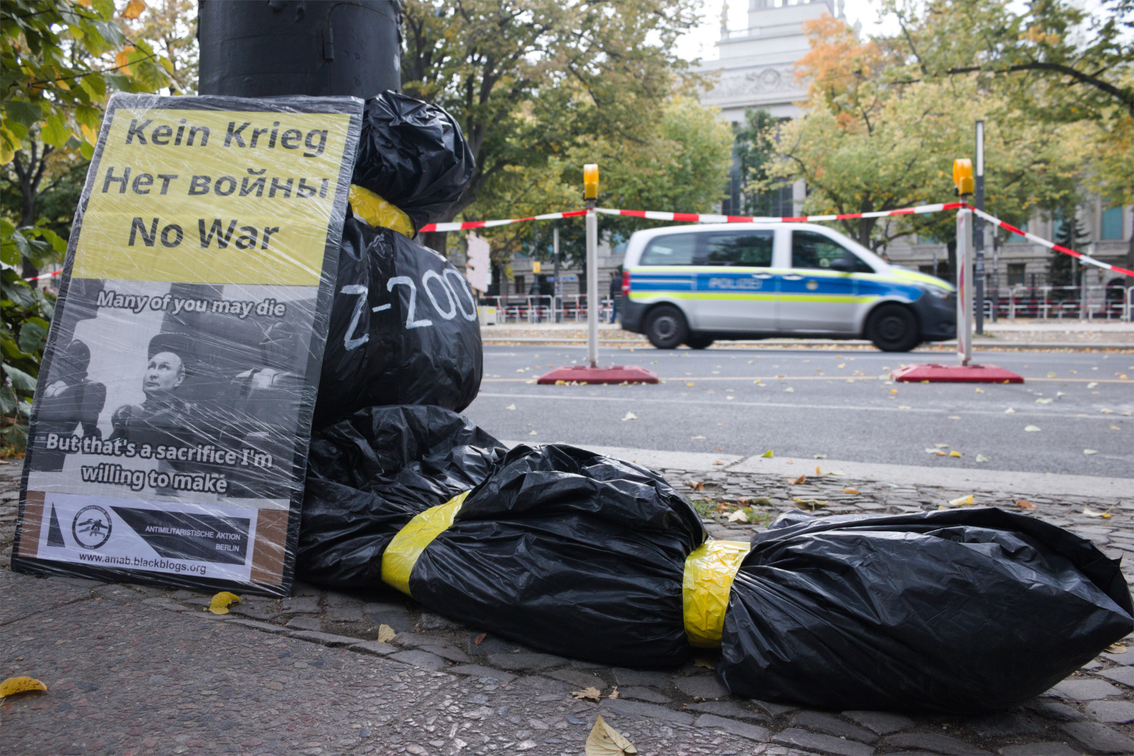 Die Antimilitaristische Aktion Berlin wollte der Öffentlichkeit zeigen, dass es auch Widerspruch zum Putin-Schmutz in der Friedensbewegung gibt. Deshalb verteilte die Gruppe selbst gebastelte symbolische Leichensäcke rund um die russische Botschaft und das „Russische Haus„. Die Aktion sollte die Folgen der russischen Invasion zeigen.