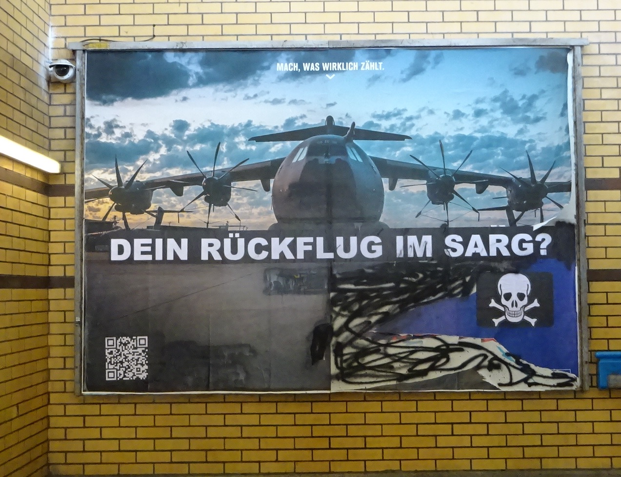 „Rückflug im Sarg?“ Adbusting-Aktion gegen Bundeswehr in Berlin-Neukölln