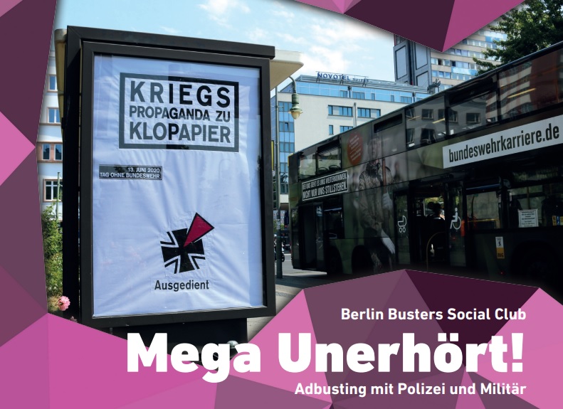 Wir haben den Berlin Busters Social Club für eine Buchvorstellung eingeladen. Der Berlin Busters Social Club sammelt, archiviert und dokumentiert Kommunikationsguerilla-Aktionen wie z. B. Adbusting. Adbusting ist ein Kunstwort aus engl. Advertising (Werbung) und to bust (stören, kaputt machten). Beim Adbusting kapern Aktivist*innen unerlaubt z. B. Bundeswehr-Werbung und verändern sie mit Farbe, Kleber oder Papier derart, dass sie damit im öffentlichen Raum das Militär kritisieren. Das finden wir spannend, deshalb haben wir den Club gebeten, das Buch „Mega Unerhört! Adbusting mit Polizei und Militär“, dass auch von der DFG-VK unterstützt wurde, einmal vorzustellen und mit uns die Möglichkeiten und Grenzen der Aktionsform zu diskutieren Für uns besonders interessant: „Mega Unerhört! Adbusting mit Polizei und Militär“ dokumentiert auch die vielen kreativen Aktionen gegen den Tag der Bundeswehr in Berlin in den letzten Jahren.