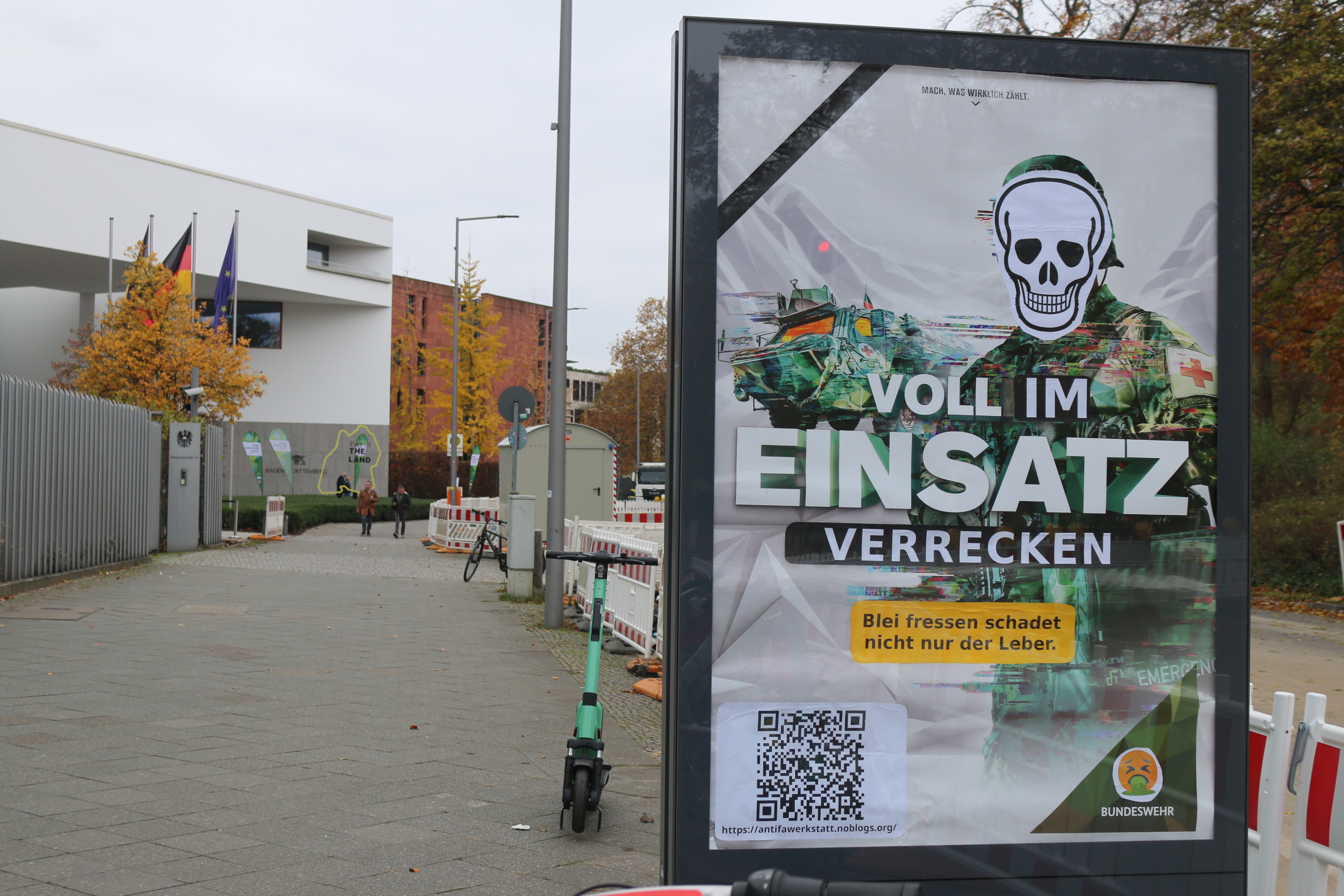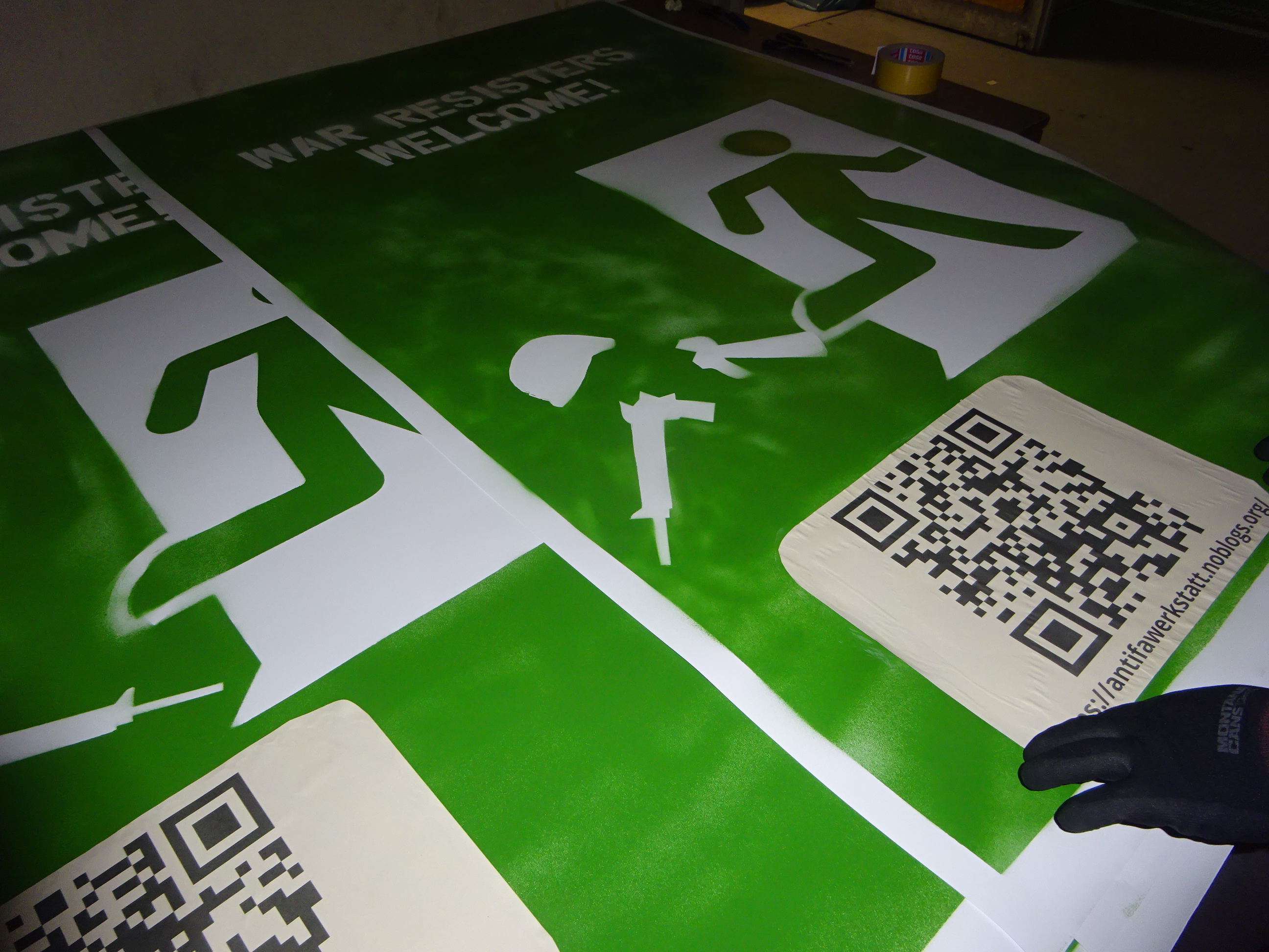 Theorie, Wissenvermittung und Praxis zusammen bringen: Das haben die Aktiven der Werkstatt für Antifaschistische Aktionen (w2a) bei ihrem Wochenend-Veranstaltung „Rob dictators of their army! Skillshare zu Kreativ-Protest gegen Krieg und Militär“ am 22.-24.11.2024 versucht. Am Freitag haben sie eine Lernwerkstatt veranstaltet. Samstag und Sonntag haben sie eigene Poster mit einem umgestalteten Notausgang-Zeichen gestaltet. Der Slogan dazu: „War Resisters welcome!“ Hier im Text schildern sie, was wir erlebt haben (erst die Lernwerkstatt und dann das Basteln):