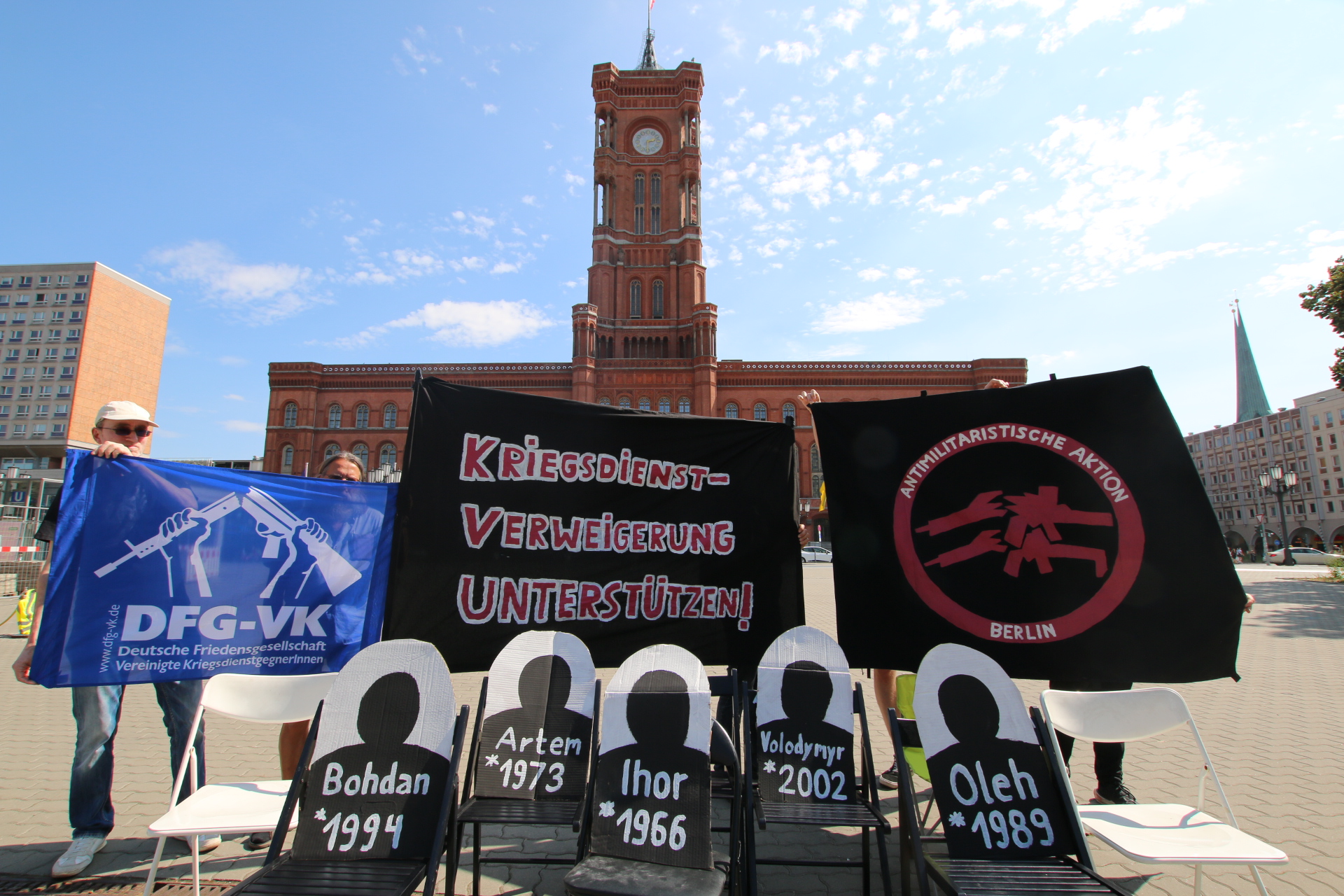 „Kriegsdienstverweigerung unterstützen!“ Das forderten heute am Berliner Innensenat die Antimilitaristische Aktion Berlin und der Landesverband Berlin-Brandenburg der Deutschen Friedensgesellschaft-Vereinigte Kriegsgegner*innen (DFG-VK). Denn der Berliner Senat weigert sich, ukrainischen Männern im „wehrfähigen Alter“ weiterhin Ersatzpapiere auszustellen. „Geflüchtete Kriegsdienstverweiger*innen brauchen ein uneingeschränktes Bleiberecht!“ fordert Toni Schultz, Sprecher*in der DFG-VK Berlin-Brandenburg.