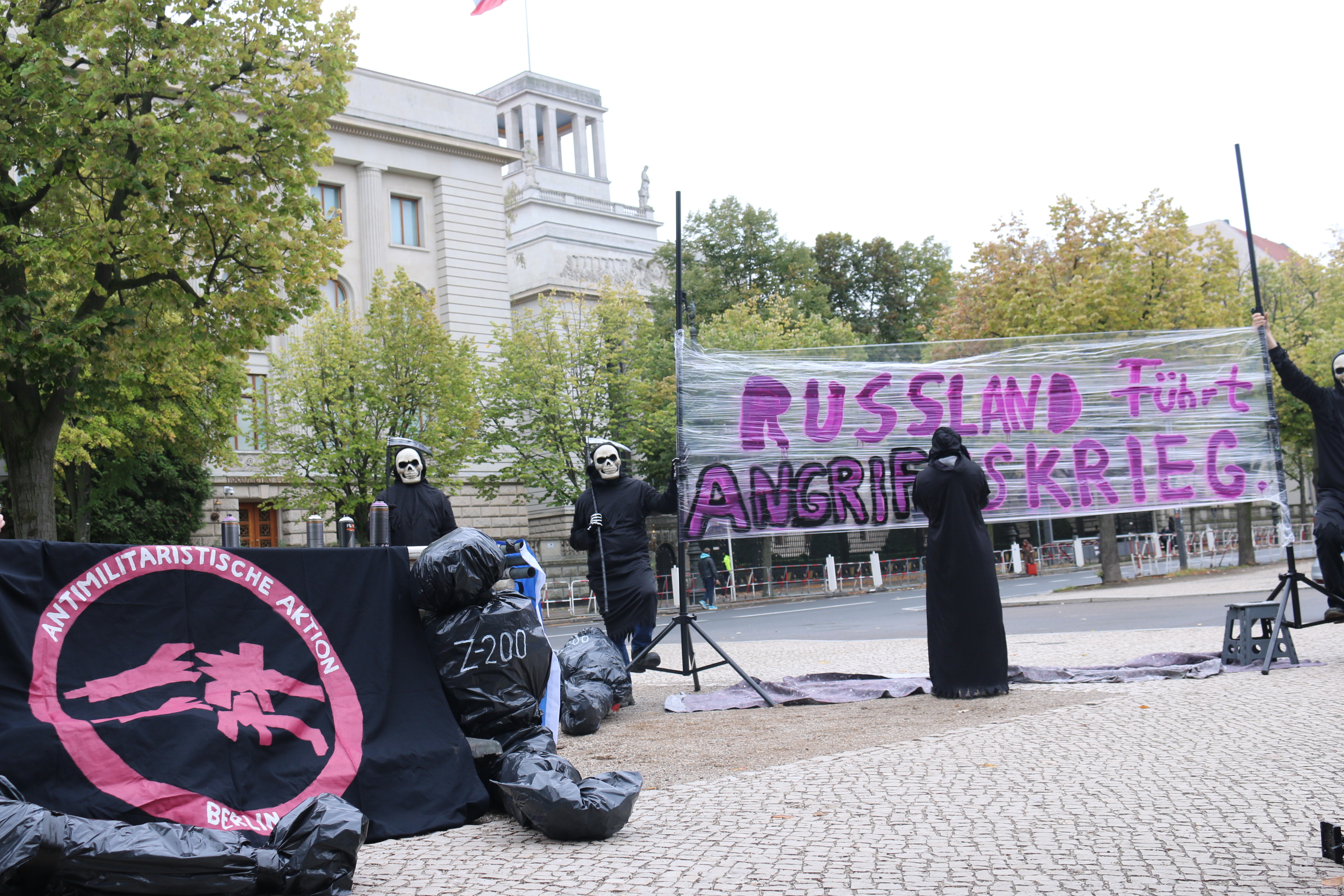 Am 3.10.2024 haben wir vor der Russischen Botschaft mit einer Leichensack-Grafiti-Todkostüm-Aktion klar gestellt: „Russland führt Angriffskrieg.“ Anlass war eine angebliche „Friedensdemo“ von Reiner und Zahra. Auf der Demo wurde SPD-Bundestagsabgeordneter Ralf Stegner ausgebuht, als er „russischer Angriffskrieg gesagt hat. Unsere Aktion fand breites Echo in den Medien und sorgte auch bereits im September für ordentlich Wirbel. Hier der Medien-Spiegel zu unserer gelungenen Ehrenrettungs-Aktion für die DFG-VK: